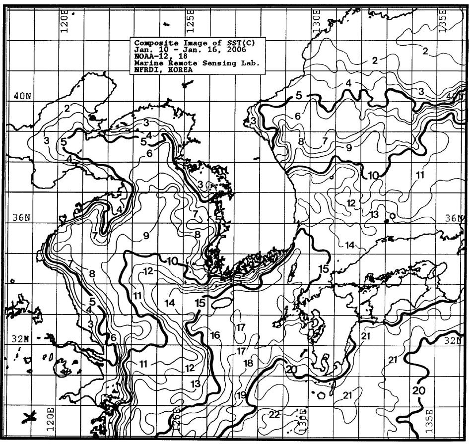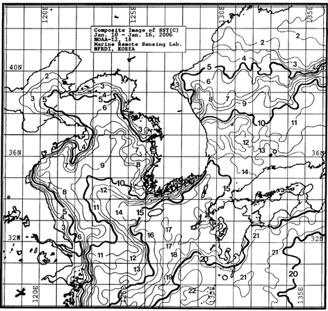 o 금주(2006.01.10~01.16)의 한국근해 표면수온은 대화퇴 8~11, 울릉도 근해 10~12도, 대마도 근해 15~16도, 제주도 근해 14~16도, 이어도 근해 10~12도, 일향초 근해 10~13도, 어청도 근해 6~7도 내외로 나타납니다. o「평년에 비해」 대화퇴 근해 0.5도 낮게, 울릉도 근해 1도 낮게, 대마도 0.5도 낮게, 제주도 근해 비슷하게, 이어도 근해 1.5도 낮게, 일향초 근해 0.5도 낮게, 어청도 근해 1도 낮게 나타납니다. o 수온 전선대는 제주해협 - 대한해협 서수도간 해역에서 13도를 중심으로 형성됩니다. < 위의 그림을 클릭하시면 확대된 수온정보를 보실 수 있습니다 >