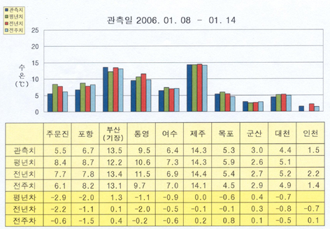 o 금주(2006.01.08~01.14)의 한반도 연안 표면수온은 동해 연안역에서 섭씨 5~7도, 남해 연안역 6~14도, 서해 연안역에서 1~5도 내외로 나타납니다.