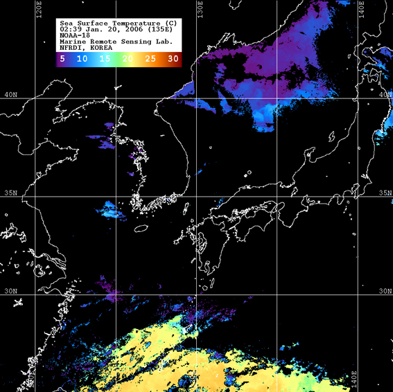 o 2006년 01월 20일 02시 39분 NOAA-18호 위성영상입니다. o 수온분포는 범례를 참고하시기 바랍니다. o 검은색은 구름 또는 육지를 나타냅니다.
