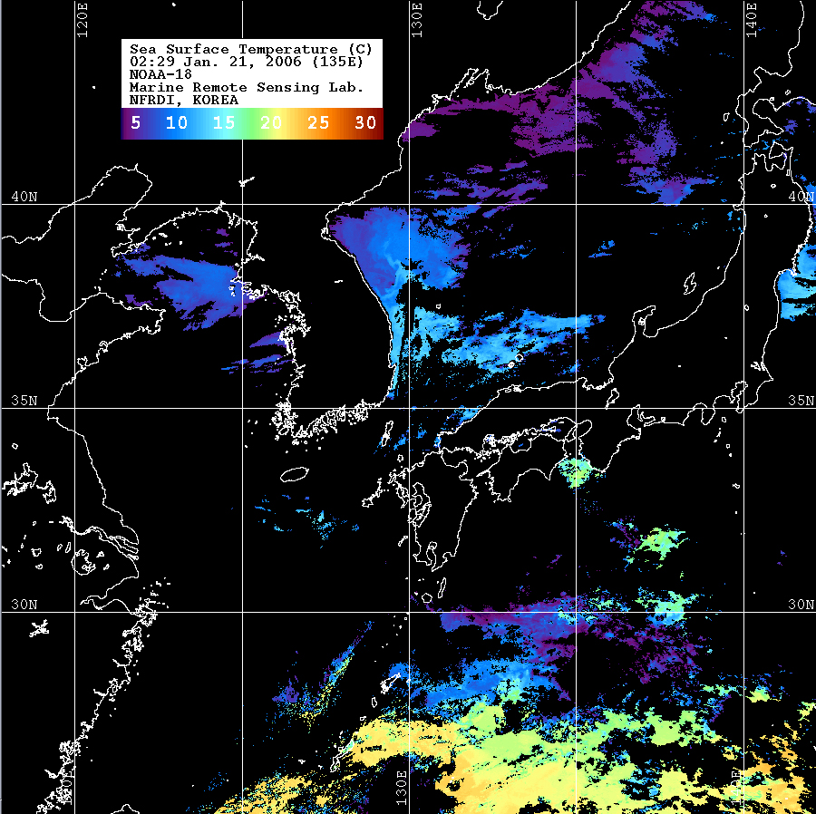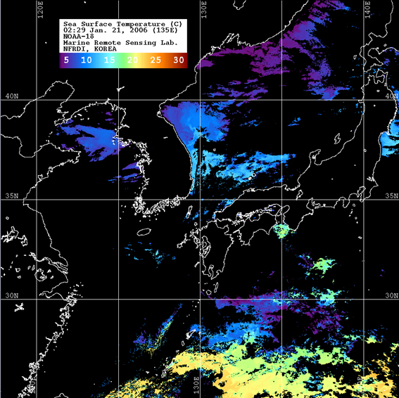 o 2006년 01월 21일 02시 29분 NOAA-18호 위성영상입니다. o 수온분포는 범례를 참고하시기 바랍니다. o 검은색은 구름 또는 육지를 나타냅니다.