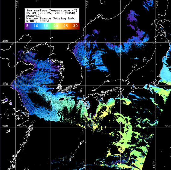 o 2006년 01월 25일 05시 49분 NOAA-12호 위성영상입니다. o 수온분포는 범례를 참고하시기 바랍니다. o 검은색은 구름 또는 육지를 나타냅니다.