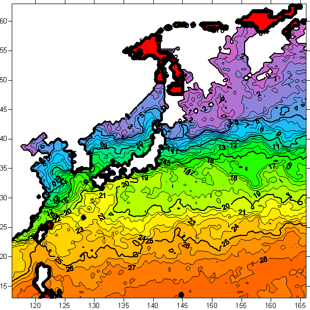 o 2006년 1월 25일 북서태평양 광역해양 수온분포 입니다.