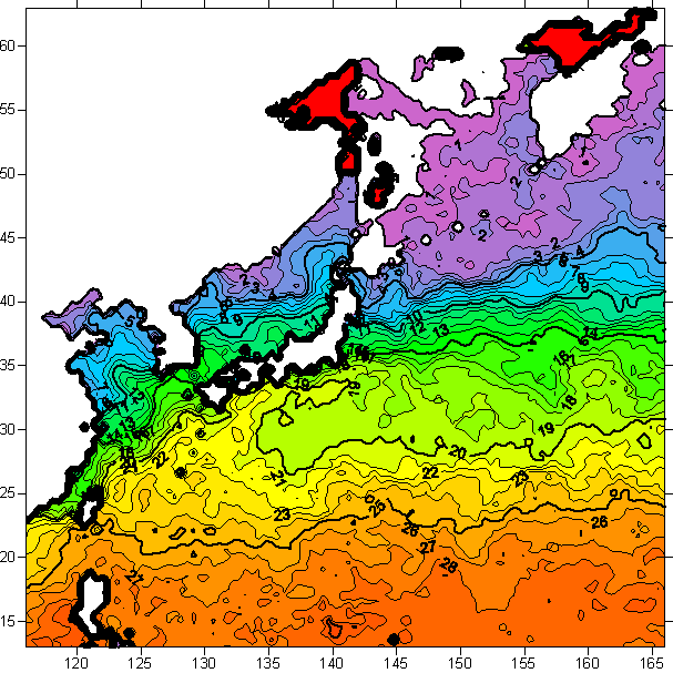 o 2006년 1월 29일 북서태평양 광역해양 수온분포 입니다.