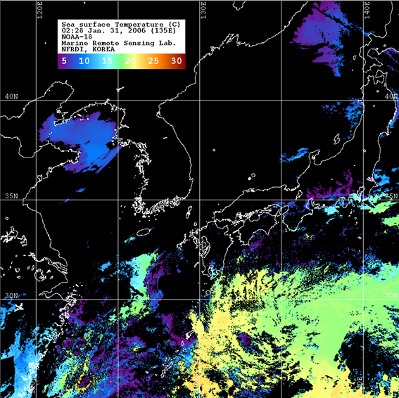 o 2006년 01월 31일 02시 28분 NOAA-18호 위성영상입니다. o 수온분포는 범례를 참고하시기 바랍니다. o 검은색은 구름 또는 육지를 나타냅니다.