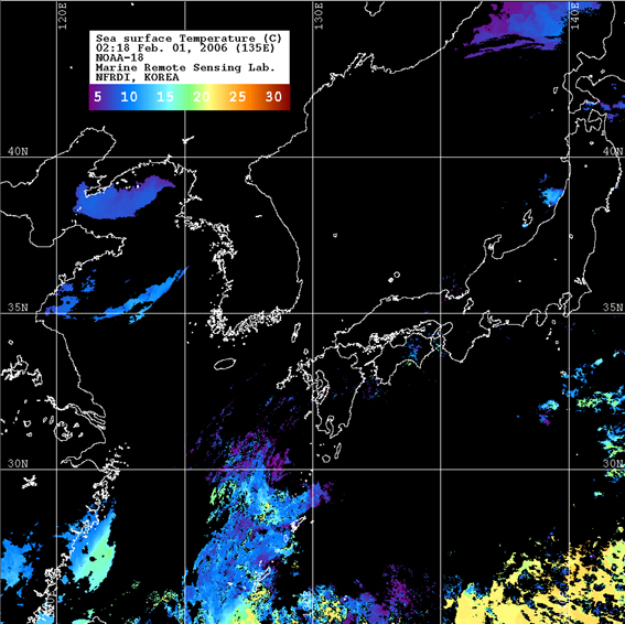 o 2006년 02월 01일 02시 18분 NOAA-18호 위성영상입니다. o 수온분포는 범례를 참고하시기 바랍니다. o 검은색은 구름 또는 육지를 나타냅니다.