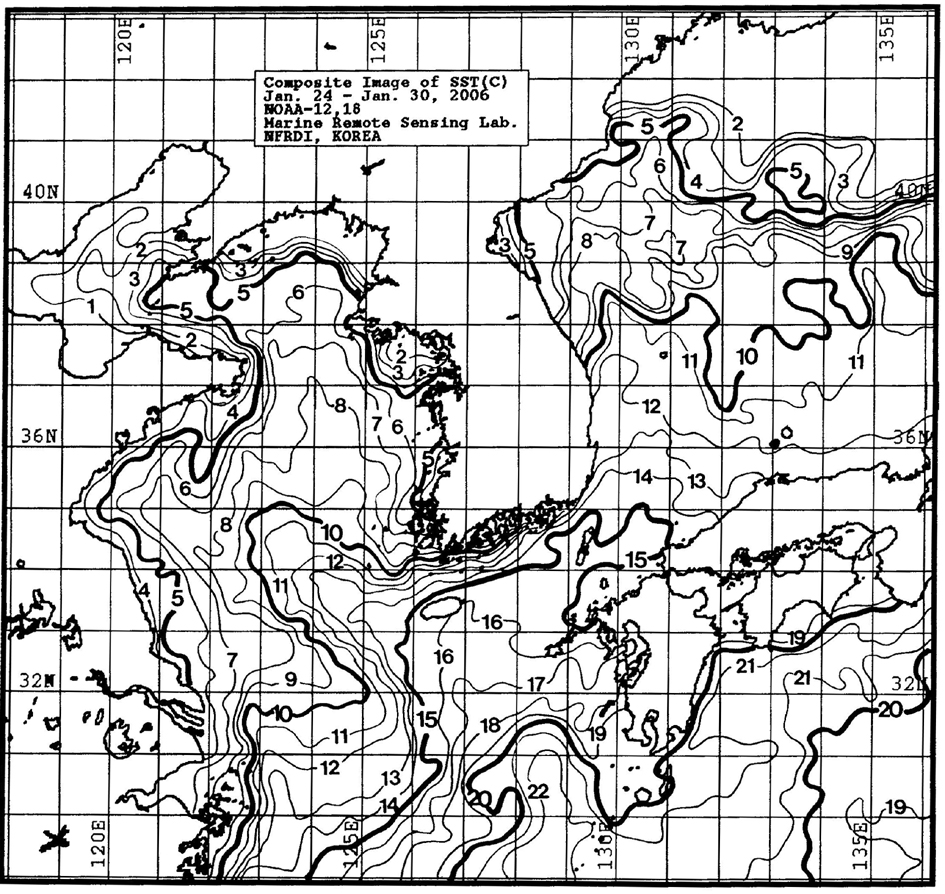 o 금주(2006.01.24~01.30)의 한국근해 표면수온은 대화퇴 7~9, 울릉도 근해 11~12도, 대마도 근해 14~16도, 제주도 근해 14~16도, 이어도 근해 9~11도, 일향초 근해 10~ 12도, 어청도 근해 5~7도 내외로 나타납니다. o「평년에 비해」 대화퇴 근해 0.5도 높게, 울릉도 및 대마도 0.5도 높게, 제주도 근해 1도 높게, 이어도 근해 1도 낮게, 일향초 근해 1도 높게, 어청도 근해 0.5도 낮게 나타납니다. o 수온 전선대는 제주해협 - 대한해협 서수도간 해역에서 13도를 중심으로 형성됩니다. < 위의 그림을 클릭하시면 확대된 수온정보를 보실 수 있습니다 >