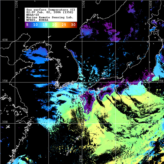 o 2006년 02월 02일 02시 07분 NOAA-18호 위성영상입니다. o 수온분포는 범례를 참고하시기 바랍니다. o 검은색은 구름 또는 육지를 나타냅니다.