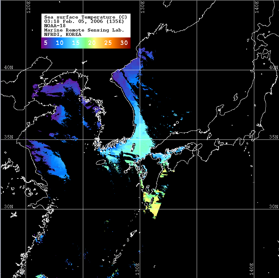 o 2006년 02월 05일 03시 18분 NOAA-18호 위성영상입니다. o 수온분포는 범례를 참고하시기 바랍니다. o 검은색은 구름 또는 육지를 나타냅니다.