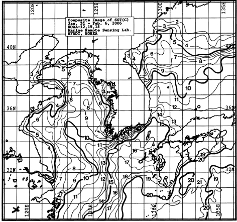 o 금주(2006.01.31~02.06)의 한국근해 표면수온은 대화퇴 7~9, 울릉도 근해 11~12도, 대마도 근해 15~16도, 제주도 근해 14~16도, 이어도 근해 9~11도, 일향초 근해 9~11도, 어청도 근해 5~6도 내외로 나타납니다.
