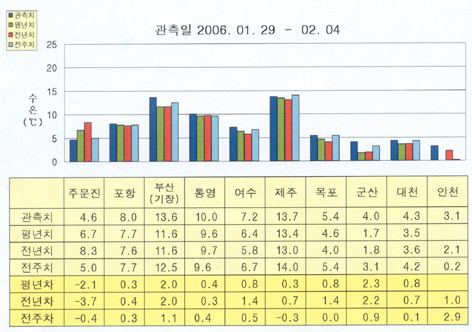 o 금주(2006.01.29~02.04)의 한반도 연안 표면수온은 동해 연안역에서 섭씨 4~8도, 남해 연안역 7~14도, 서해 연안역에서 3~6도 내외로 나타납니다.