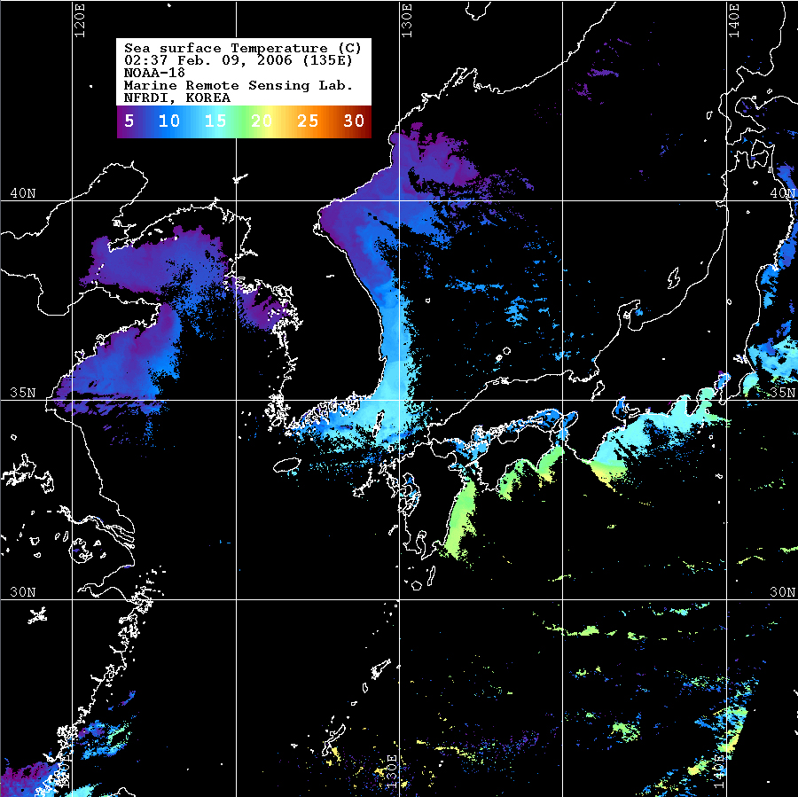 o 2006년 02월 09일 02시 37분 NOAA-18호 위성영상입니다. o 수온분포는 범례를 참고하시기 바랍니다. o 검은색은 구름 또는 육지를 나타냅니다.