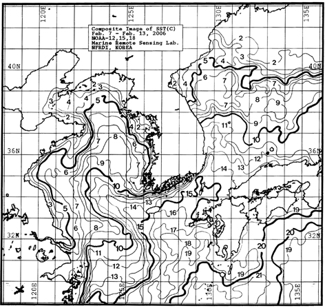 o 금주(2006.02.07~02.13)의 한국근해 표면수온은 대화퇴 6~8, 울릉도 근해 10~11도, 대마도 근해 14~16도, 제주도 근해 13~16도, 이어도 근해 9~10도, 일향초 근해 11~12도, 어청도 근해 5~6도 내외로 나타납니다. o「평년에 비해」 대화퇴 근해 1도 높게, 울릉도 근해 0.5도 높게, 대마도 1도 높게, 제주도 근해 0.5도 높게, 이어도 근해 비슷하게, 일향초 근해 1.5도 높게, 어청도 근해는 0.5도 높게 나타납니다. o 수온 전선대는 제주해협 - 대한해협 서수도간 해역에서 13도를 중심으로 형성됩니다. < 위의 그림을 클릭하시면 확대된 수온정보를 보실 수 있습니다 >