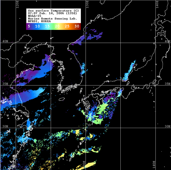 o 2006년 02월 14일 0시 07분 NOAA-15호 위성영상입니다. o 수온분포는 범례를 참고하시기 바랍니다. o 검은색은 구름 또는 육지를 나타냅니다.