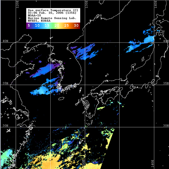 o 2006년 02월 16일 03시 06분 NOAA-18호 위성영상입니다. o 수온분포는 범례를 참고하시기 바랍니다. o 검은색은 구름 또는 육지를 나타냅니다.