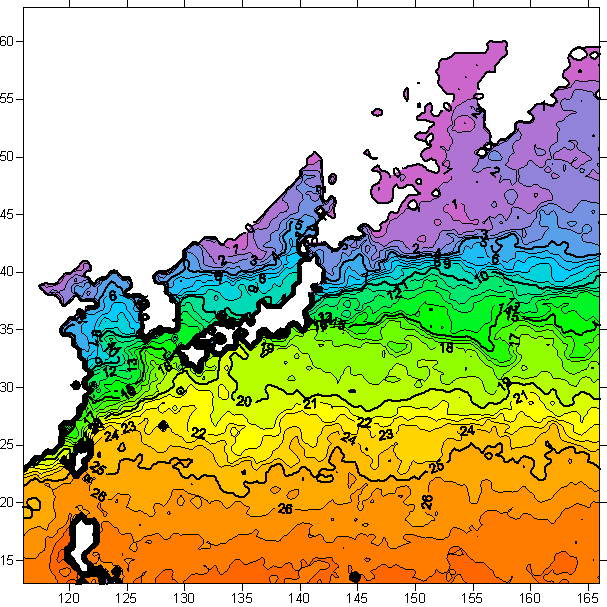 o 2006년 2월 15일 북서태평양 광역해양 수온분포 입니다.