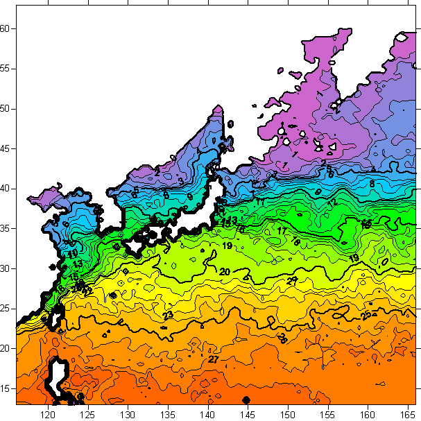 o 2006년 2월 16일 북서태평양 광역해양 수온분포 입니다.
