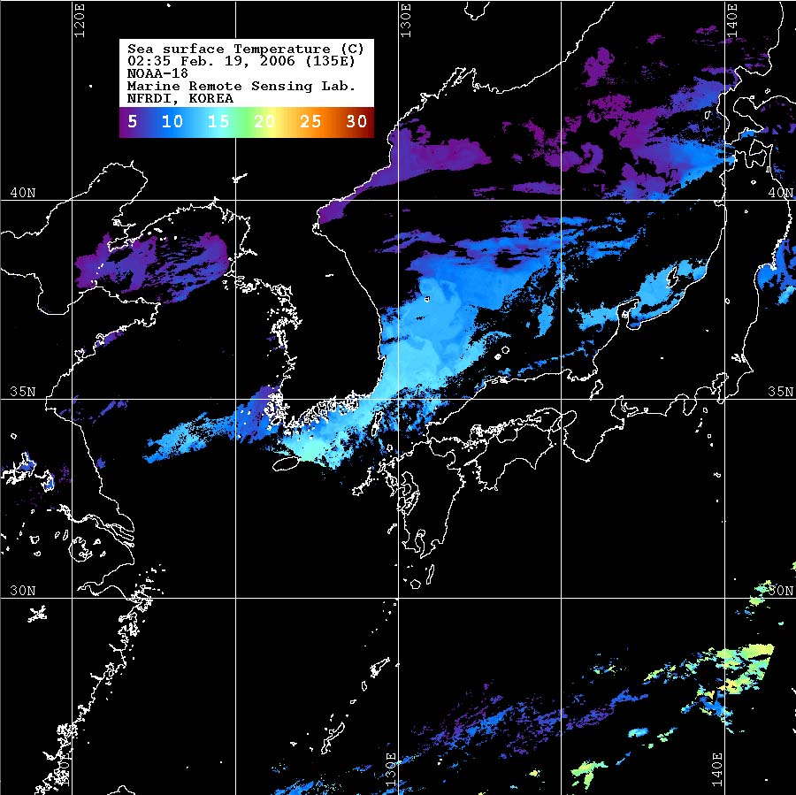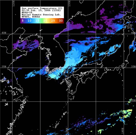 o 2006년 02월 19일 02시 35분 NOAA-18호 위성영상입니다. o 수온분포는 범례를 참고하시기 바랍니다. o 검은색은 구름 또는 육지를 나타냅니다.