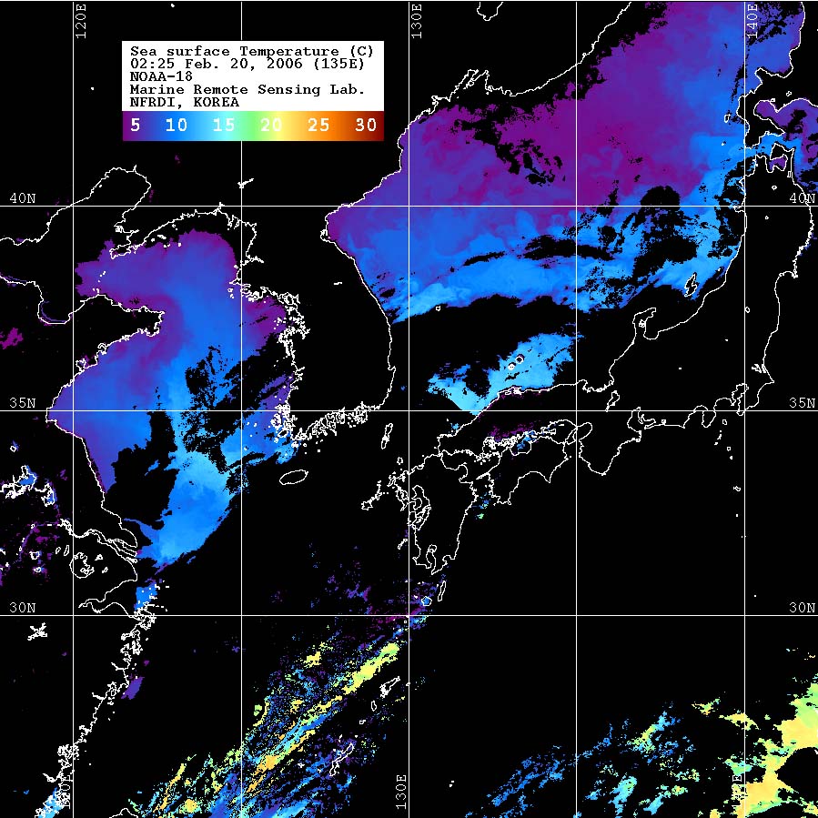 o 2006년 02월 20일 02시 25분 NOAA-18호 위성영상입니다. o 수온분포는 범례를 참고하시기 바랍니다. o 검은색은 구름 또는 육지를 나타냅니다.