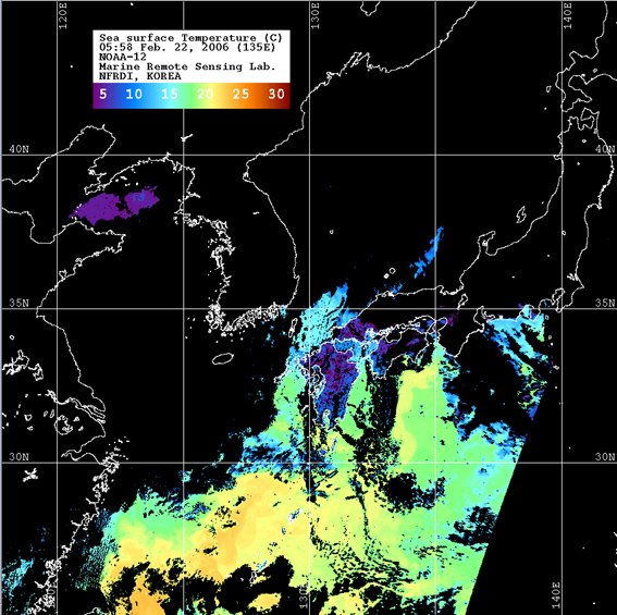 o 2006년 02월 22일 05시 58분 NOAA-12호 위성영상입니다. o 수온분포는 범례를 참고하시기 바랍니다. o 검은색은 구름 또는 육지를 나타냅니다.