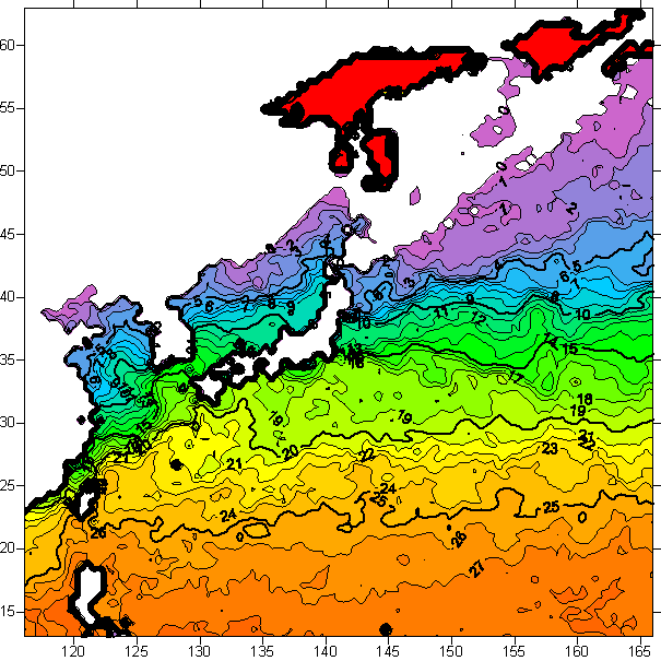 o 2006년 2월 21일 북서태평양 광역해양 수온분포 입니다.