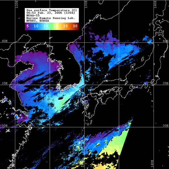 o 2006년 02월 23일 06시 53분 NOAA-15호 위성영상입니다. o 수온분포는 범례를 참고하시기 바랍니다. o 검은색은 구름 또는 육지를 나타냅니다.