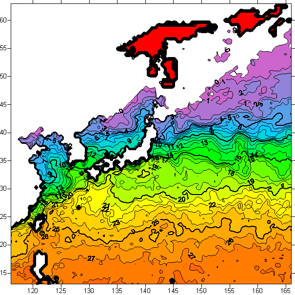 o 2006년 2월 22일 북서태평양 광역해양 수온분포 입니다.