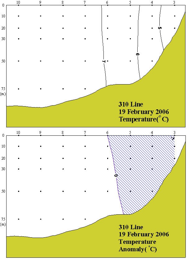 ◦ 2006년 2월 19일 국립수산과학원 서해수산연구소에서 조사한 310선 (영광 서방)의 수직수온분포도 및 평년편차도 입니다.
