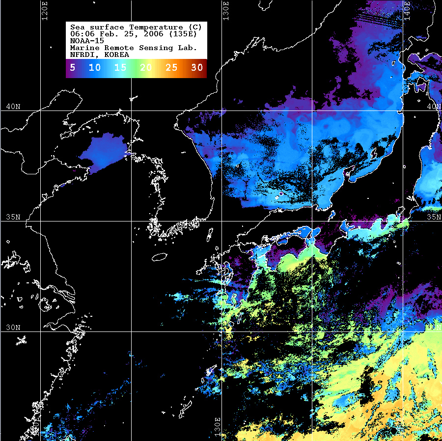 o 2006년 02월 25일 06시 06분 NOAA-15호 위성영상입니다. o 수온분포는 범례를 참고하시기 바랍니다. o 검은색은 구름 또는 육지를 나타냅니다.