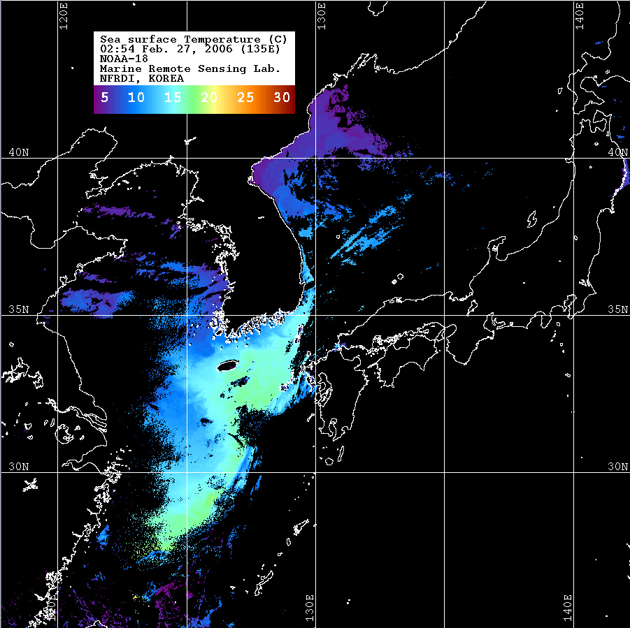 o 2006년 02월 27일 02시 54분 NOAA-18호 위성영상입니다. o 수온분포는 범례를 참고하시기 바랍니다. o 검은색은 구름 또는 육지를 나타냅니다.