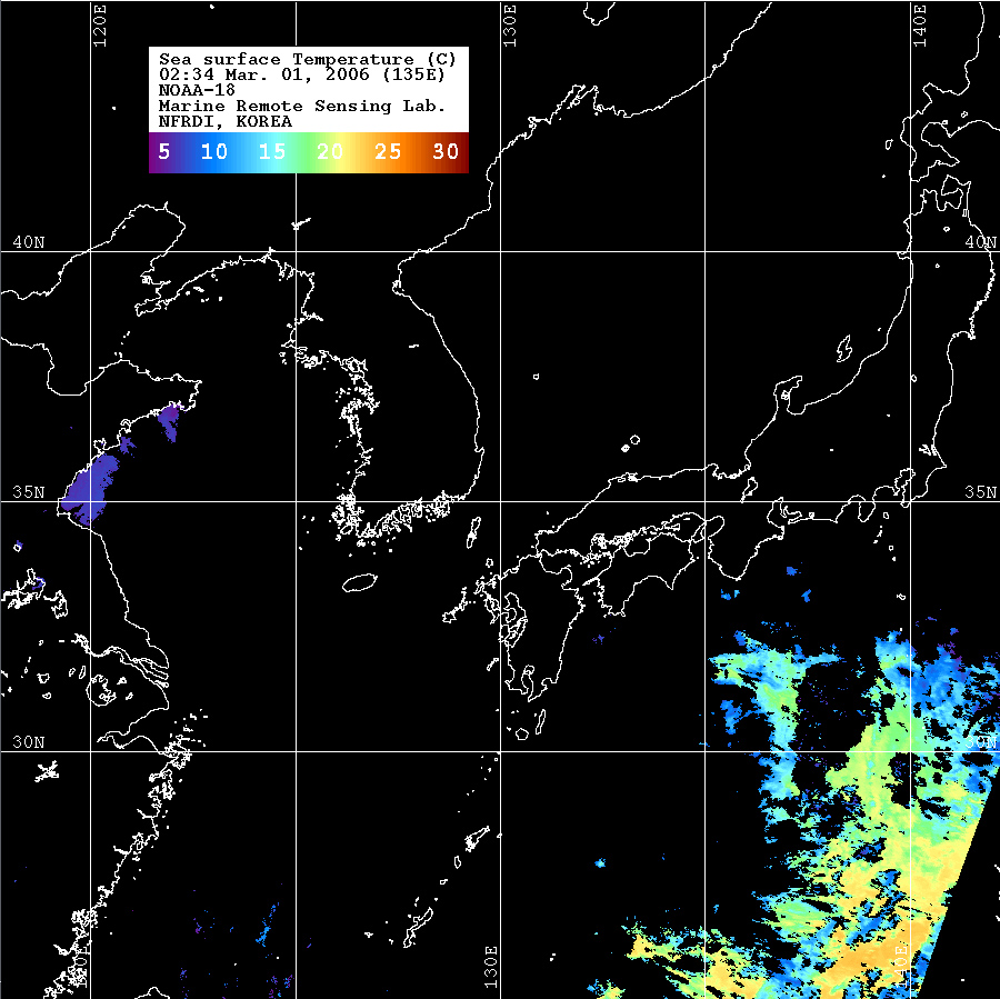 o 2006년 03월 01일 02시 34분 NOAA-18호 위성영상입니다. o 수온분포는 범례를 참고하시기 바랍니다. o 검은색은 구름 또는 육지를 나타냅니다.