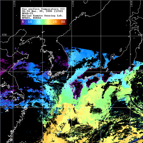 o 2006년 03월 05일 06시 16분 NOAA-15호 위성영상입니다. o 수온분포는 범례를 참고하시기 바랍니다. o 검은색은 구름 또는 육지를 나타냅니다.