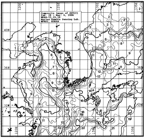 o 금주(2006.02.28~03.06)의 한국근해 표면수온은 대화퇴 7~9, 울릉도 근해 10~11도, 대마도 근해 14~15도, 제주도 근해 14~15도, 이어도 근해 9~10도, 일향초 근해 9~11도, 어청도 근해 4~6도 내외로 나타납니다.