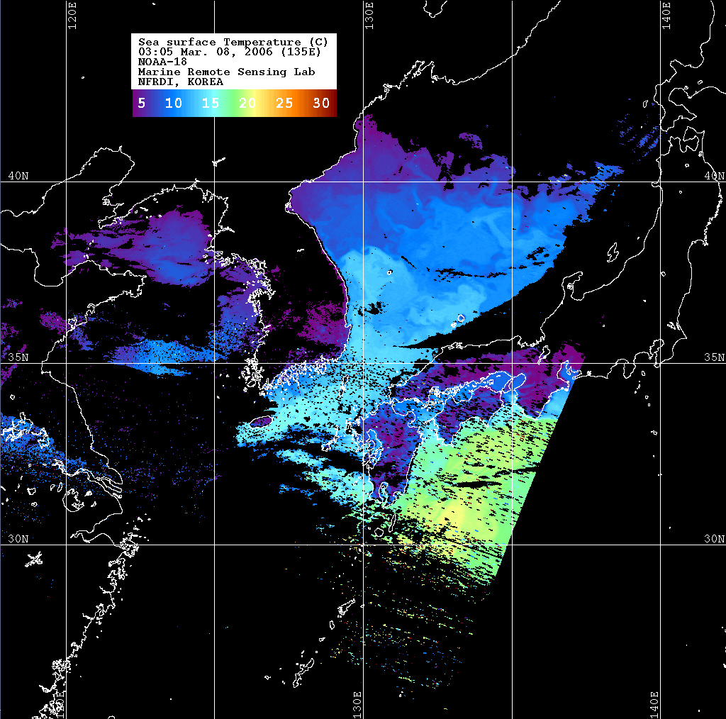 o 2006년 03월 08일 03시 05분 NOAA-18호 위성영상입니다. o 수온분포는 범례를 참고하시기 바랍니다. o 검은색은 구름 또는 육지를 나타냅니다.