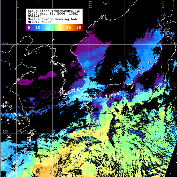 o 2006년 03월 11일 02시 32분 NOAA-18호 위성영상입니다. o 수온분포는 범례를 참고하시기 바랍니다. o 검은색은 구름 또는 육지를 나타냅니다.