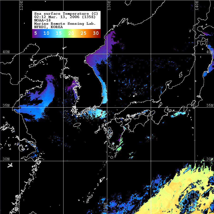 o 2006년 03월 13일 02시 12분 NOAA-18호 위성영상입니다. o 수온분포는 범례를 참고하시기 바랍니다. o 검은색은 구름 또는 육지를 나타냅니다.