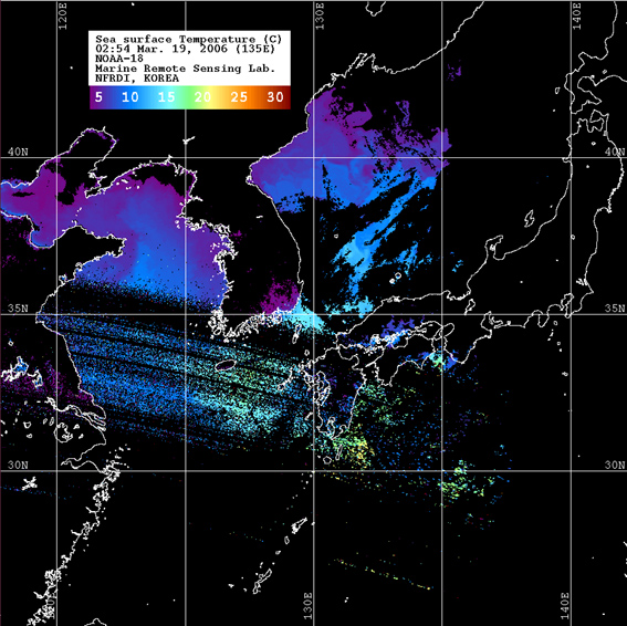o 2006년 03월 19일 02시 54분 NOAA-18호 위성영상입니다. o 수온분포는 범례를 참고하시기 바랍니다. o 검은색은 구름 또는 육지를 나타냅니다.