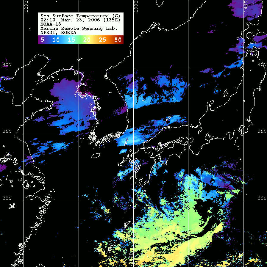o 2006년 03월 23일 02시 10분 NOAA-18호 위성영상입니다. o 수온분포는 범례를 참고하시기 바랍니다. o 검은색은 구름 또는 육지를 나타냅니다.