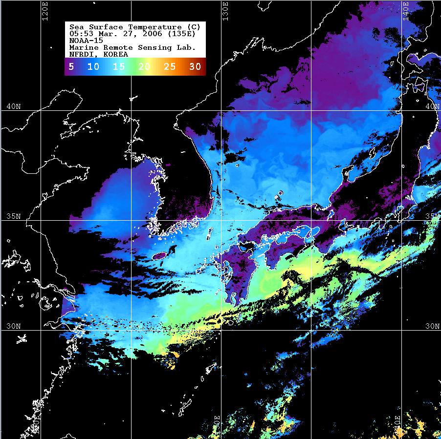 o 2006년 03월 27일 05시 53분 NOAA-15호 위성영상입니다. o 수온분포는 범례를 참고하시기 바랍니다. o 검은색은 구름 또는 육지를 나타냅니다.