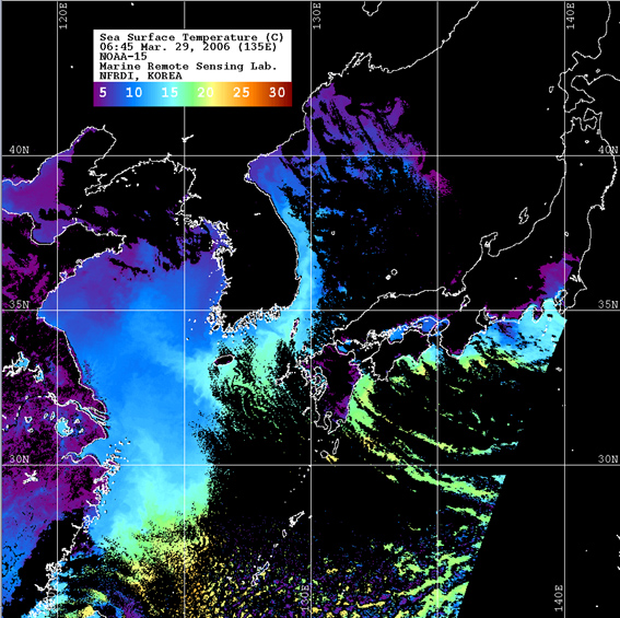 o 2006년 03월 29일 06시 45분 NOAA-15호 위성영상입니다. o 수온분포는 범례를 참고하시기 바랍니다. o 검은색은 구름 또는 육지를 나타냅니다.