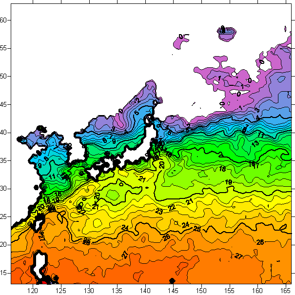o 2006년 3월 31일 북서태평양 광역해양 수온분포 입니다.