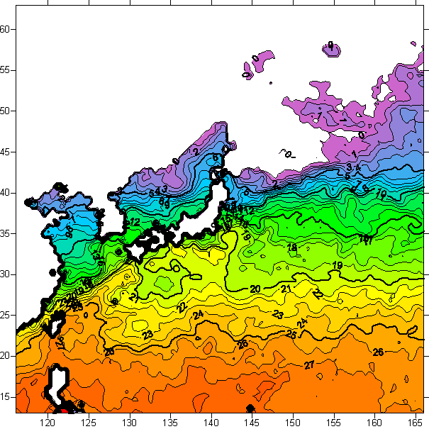 o 아래 위성 수온분포도는 국립수산과학원(NFRDI, Korea)과 일본동북대학교(Tohoku University, Japan)가 공동연구개발 진행중, 1차 연구결과인 것으로 구름의 영향을 배제한 신기술의 수온정보입니다.