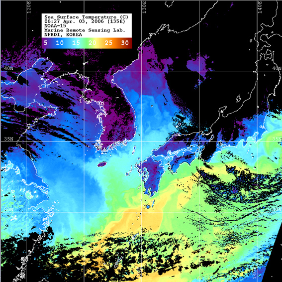 o 2006년 04월 03일 06시 27분 NOAA-15호 위성영상입니다. o 수온분포는 범례를 참고하시기 바랍니다. o 검은색은 구름 또는 육지를 나타냅니다.