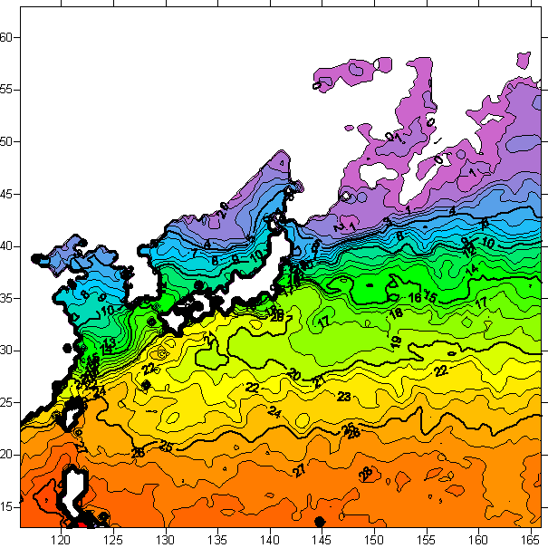 o 아래 위성 수온분포도는 국립수산과학원(NFRDI, Korea)과 일본동북대학교(Tohoku University, Japan)가 공동연구개발 진행중, 1차 연구결과인 것으로 구름의 영향을 배제한 신기술의 수온정보입니다.