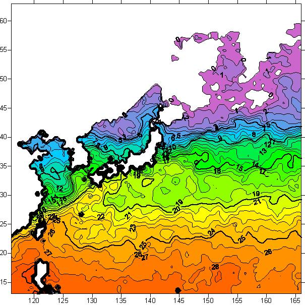 o 아래 위성 수온분포도는 국립수산과학원(NFRDI, Korea)과 일본동북대학교(Tohoku University, Japan)가 공동연구개발 진행중, 1차 연구결과인 것으로 구름의 영향을 배제한 신기술의 수온정보입니다.
