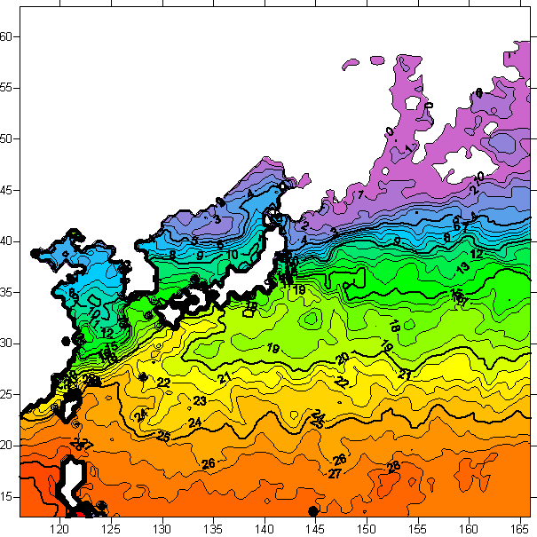 o 아래 위성 수온분포도는 국립수산과학원(NFRDI, Korea)과 일본동북대학교(Tohoku University, Japan)가 공동연구개발 진행중, 1차 연구결과인 것으로 구름의 영향을 배제한 신기술의 수온정보입니다.