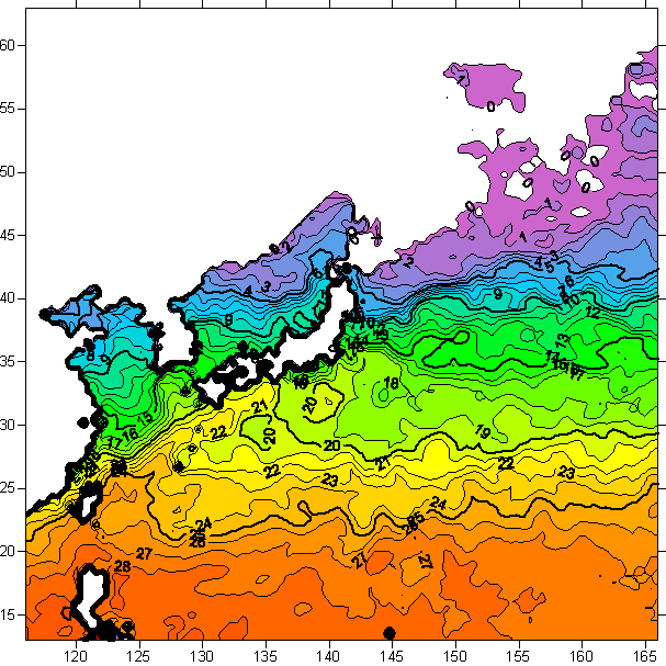 o 아래 위성 수온분포도는 국립수산과학원(NFRDI, Korea)과 일본동북대학교(Tohoku University, Japan)가 공동연구개발 진행중, 1차 연구결과인 것으로 구름의 영향을 배제한 신기술의 수온정보입니다.