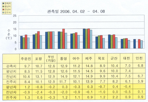 o 금주(2006.04.02~04.08)의 한반도 연안 표면수온은 동해 연안역에서 섭씨 9~11도, 남해 연안역 11~15도, 서해 연안역에서 6~11도 내외로 나타납니다.
