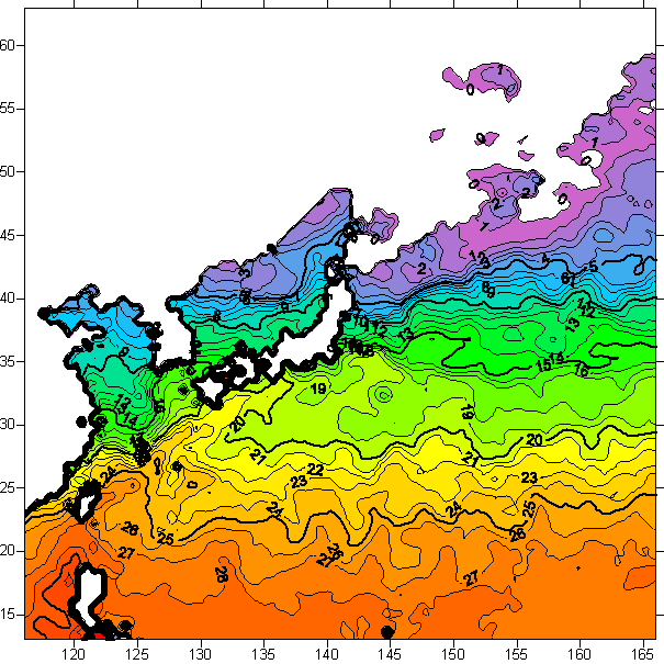 o 아래 위성 수온분포도는 국립수산과학원(NFRDI, Korea)과 일본동북대학교(Tohoku University, Japan)가 공동연구개발 진행중, 1차 연구결과인 것으로 구름의 영향을 배제한 신기술의 수온정보입니다.