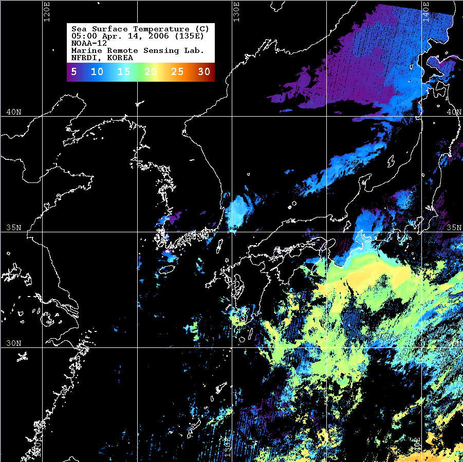 o 2006년 04월 14일 05시 00분 NOAA-12호 위성영상입니다. o 수온분포는 범례를 참고하시기 바랍니다. o 검은색은 구름 또는 육지를 나타냅니다.