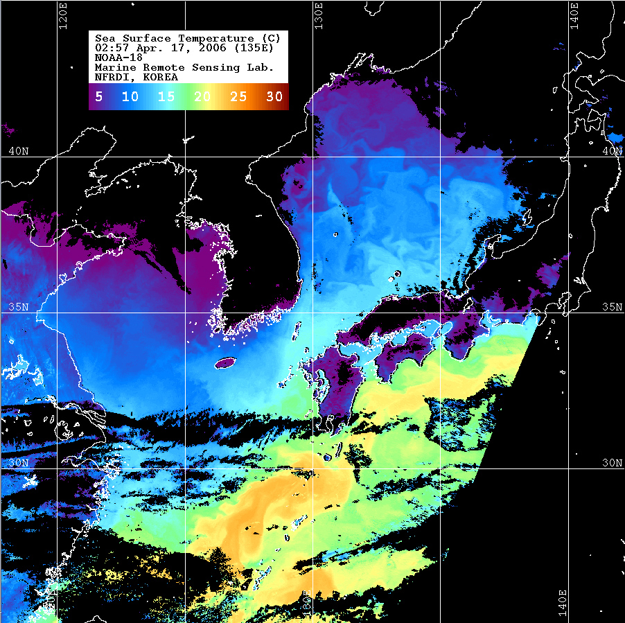 o 2006년 04월 17일 02시 57분 NOAA-18호 위성영상입니다. o 수온분포는 범례를 참고하시기 바랍니다. o 검은색은 구름 또는 육지를 나타냅니다.